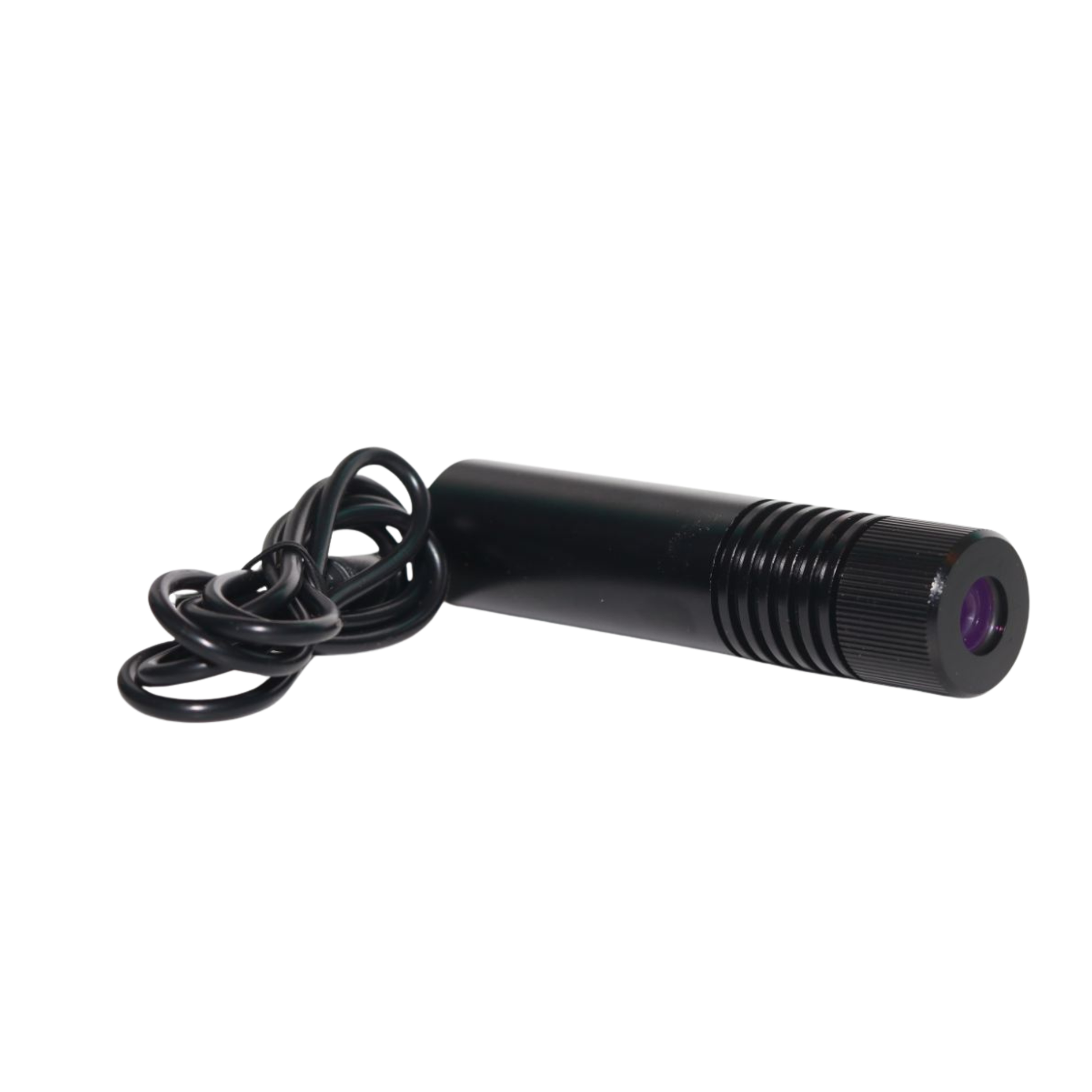 This module is available in green 30mw (which is adequate for most indoor situations) or green 150mw for well lit areas. The usable beam length depends on the angle of the laser and the environment lighting but typically gives a crisp usable line up to 40 feet. A red option is also available but please note, additional lead time can be expected since we do not stock the red modules.