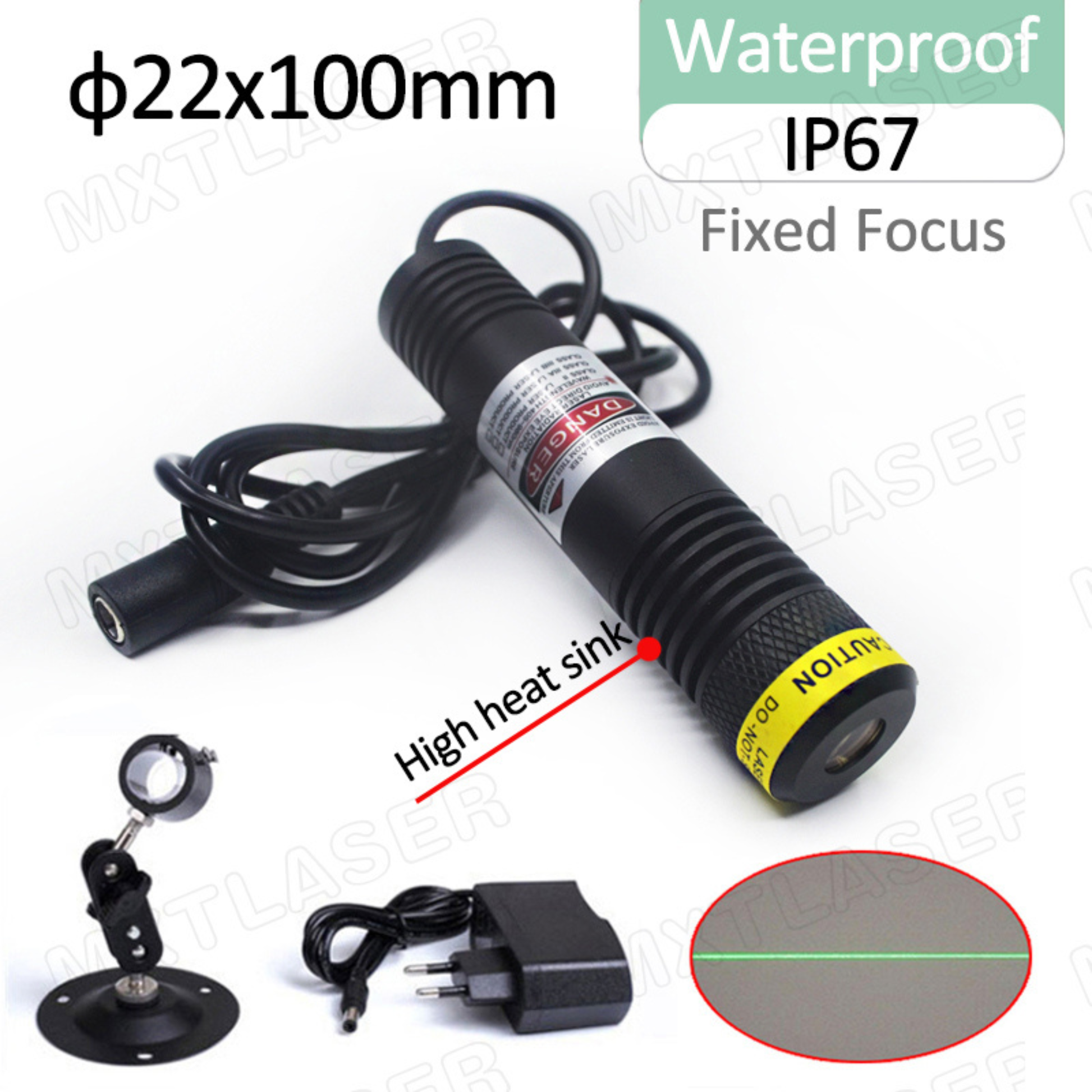 The laser module projects a sharp, crisp line up to 40 feet long projected at a 90-degree angle. You can mount it either low or high, and the length of the line is determined by the mounting angle.